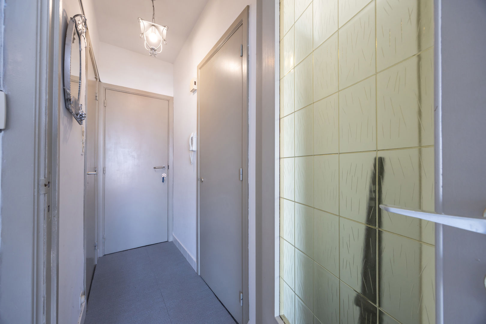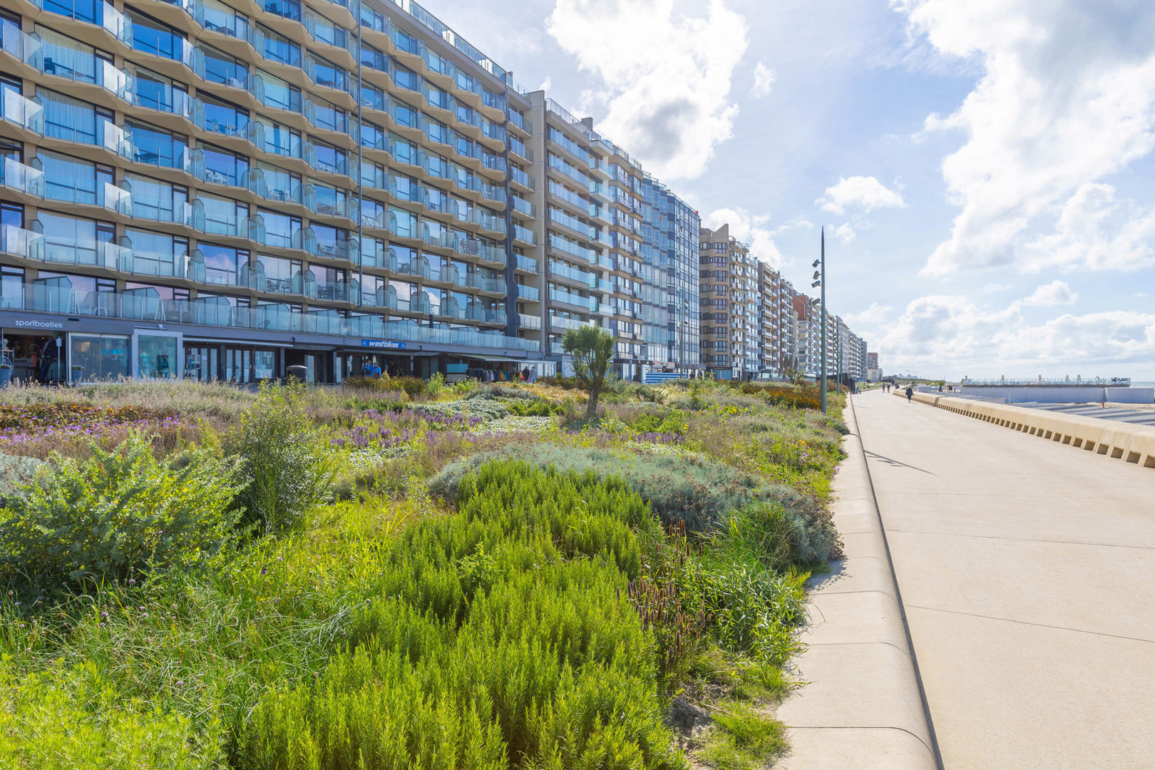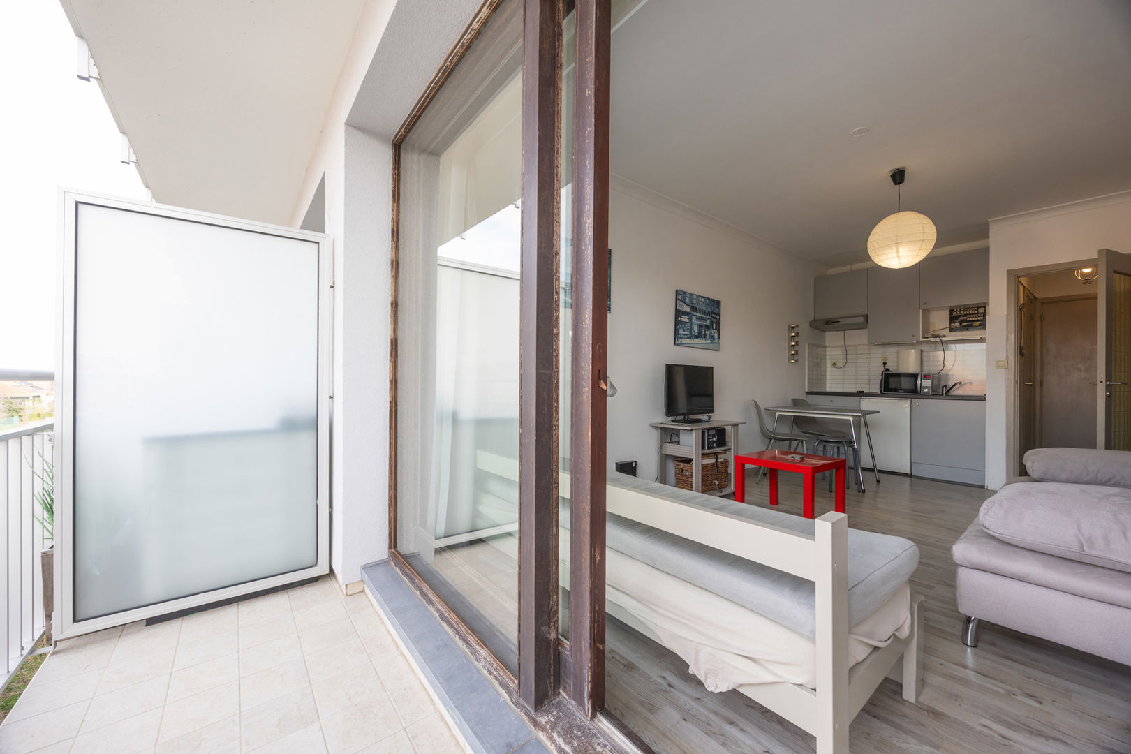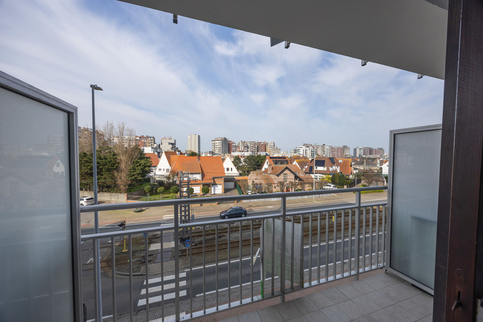 Résidence WANAKA : Au 3ième étage le long de la route du tram avec vue dégagée sur les anciens terrains de tennis et de loin sur la mer, studio meublé, comprenant : un hall d'entrée avec vestiaire, living avec cuisine murale et terrasse et salle de bains avec douche, lavabo et toilette. Cave privée au sous-sol incluse dan sla vente. Chauffage électrique. Résidence avec local à vélos et dont les façades et les terrasses ont été entièrement rénovées en 2024. NB: le double vitrage qui est condensé et que l'on voit sur les foto's va être remplacé.