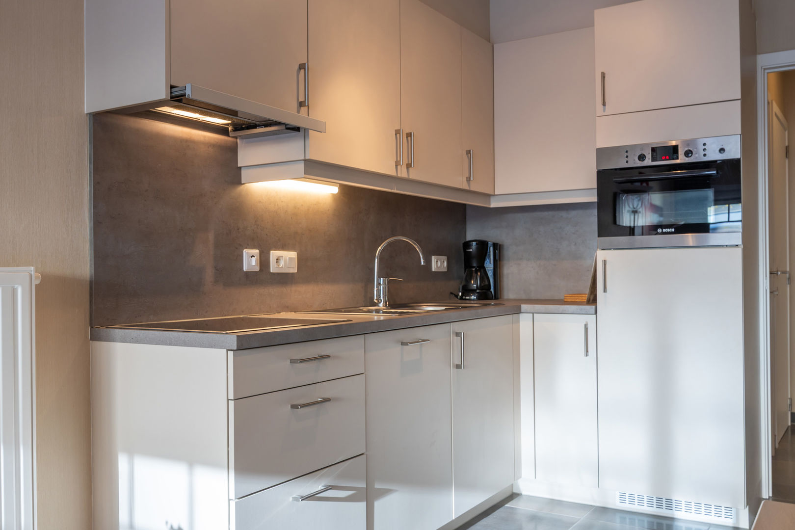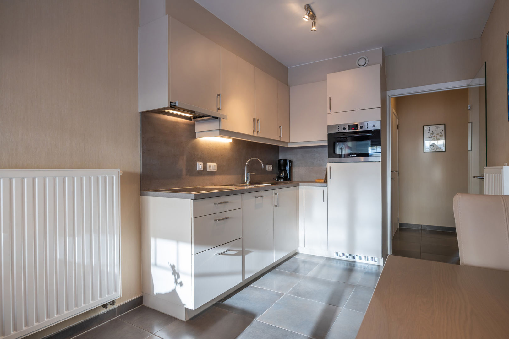 Het appartement beschikt over een lichte en gezellige leefruimte met zithoek en eetplaats, die uitgeeft op een aangenaam terras met open zicht op de omgeving. De open, volledig uitgeruste keuken is praktisch ingericht en voorzien van alle nodige toestellen.